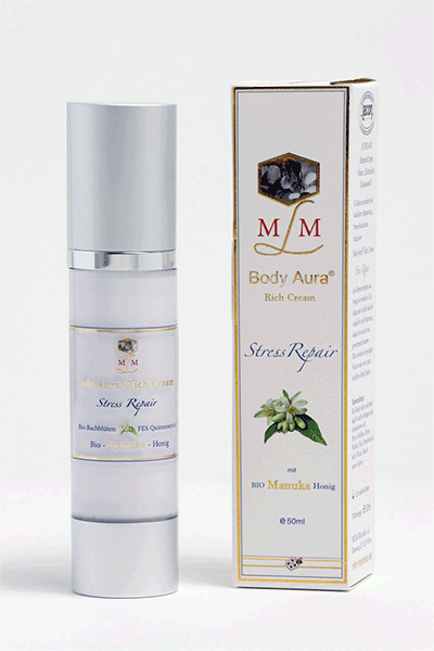 100% natural in a 50 ml airless dispenserIngredients: Organic Shea Butter, Organic Manuka Honey (MGO 514+), Organic Bach Flower Remedies, FES Quintessentials™, Organic Petitgrain Bigarde Oil, Organic Frankincense Oil, Organic Muscatel Sage Oil, Jasmine Oil, Mimosa oil, Rose Damascena Oil. In times of mental and emotional tension - in stressful situations, Body Aura® Rich Cream Stress Repair balances the body's energies, brings them back into harmony and creates balance and harmony, so that you can regain your mental freshness and new holistic strength Freshness and new holistic strength. Application: Apply gently as needed or several times a day and massage onto: Forehead and temple area, ears, neck, throat, chest area, solar plexus, abdomen as well as kidneys.